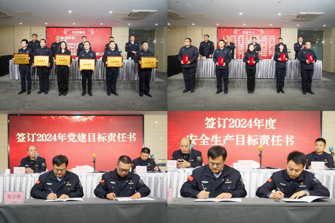 會上宣讀了《關于表彰2023年度先進集體和先進個人的通報》和《關于表彰2023年度優秀共產黨員、優秀黨務工作者和先進黨支部的通報》。公司領導為獲得表彰的集體和個人代表頒獎,并與相關人員簽訂2024年度黨建目標責任書、安全生產目標責任書、持槍人員規范用槍承諾書黨風廉政建設目標責任書。